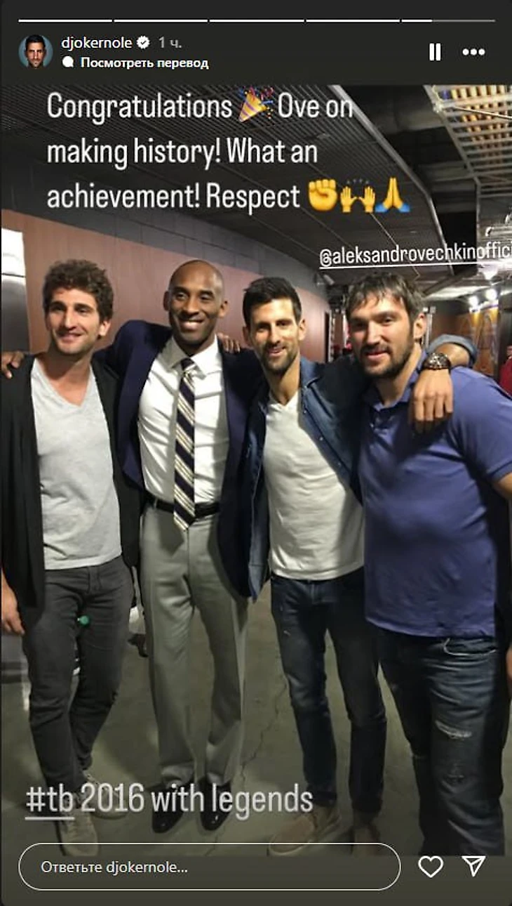 Джокович поздравил Овечкина с рекордом, выложив фото с ним и Брайантом, сделанное в 2016-м: «Потрясающее достижение! Уважение»