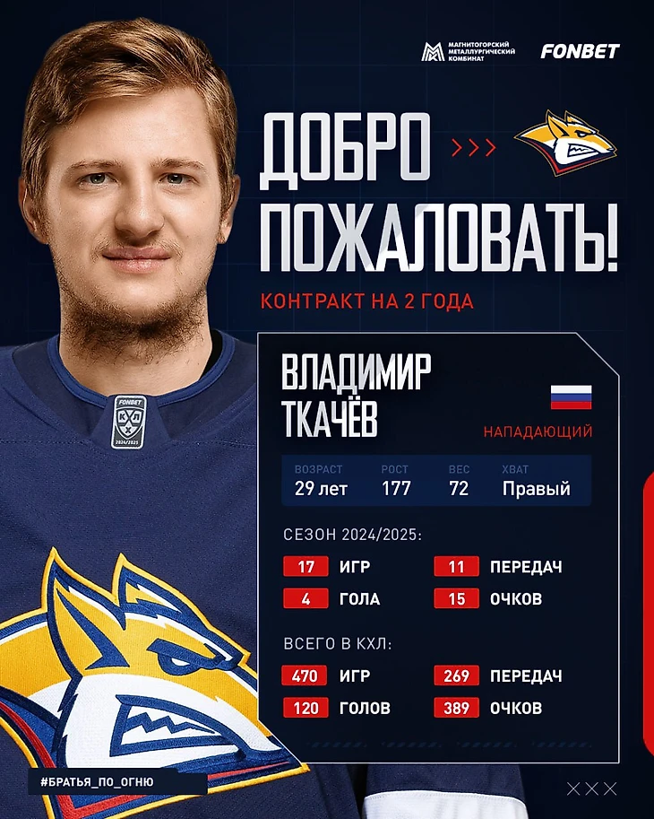 Форвард ранее получил статус свободного агента после расторжения контракта с «Авангардом». Владимир Ткачев выступал за команду на протяжении трех прошлых сезонов.