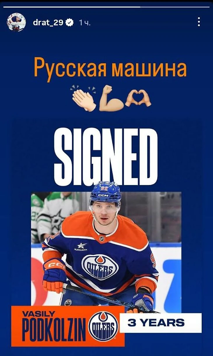 Немецкий нападающий «Эдмонтона» Леон Драйзайтль отреагировал на новость о новом контракте Подколзина и поздравил россиянина на русском языке в соцсетях, написав: «Русская машина».