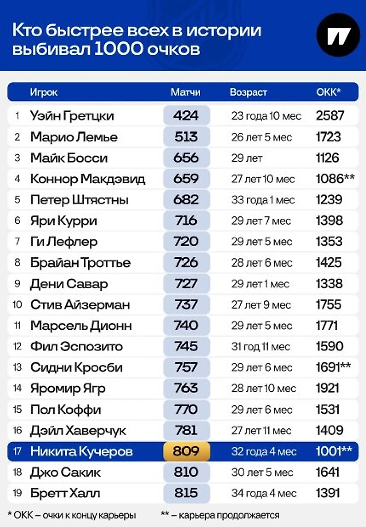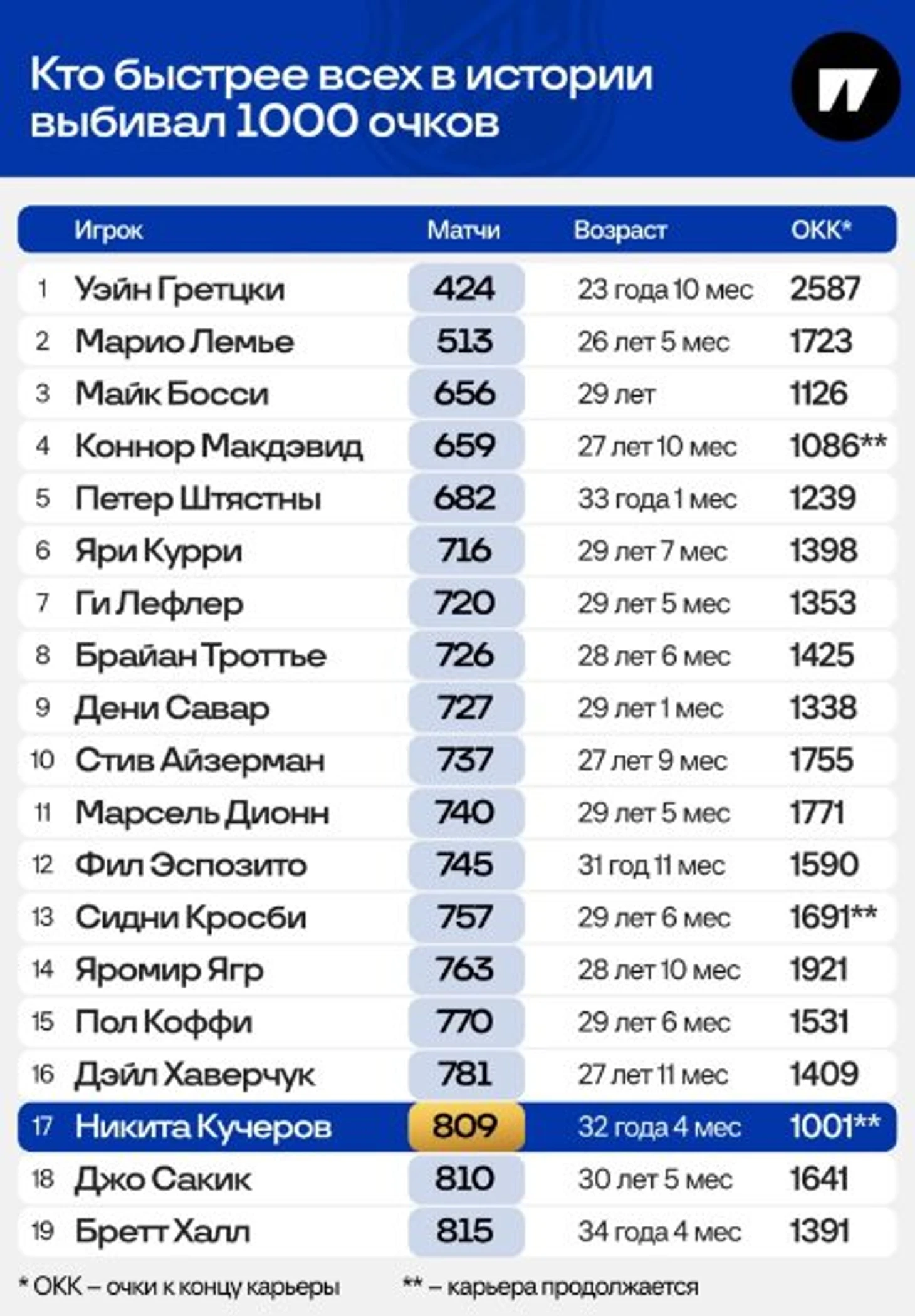 В целом по лиге результат Кучерова по скорости – 17-й. Среди действующих игроков лиги его опередили только Коннор Макдэвид («Эдмонтон», 659 игр) и Сидни Кросби («Питтсбург», 757).