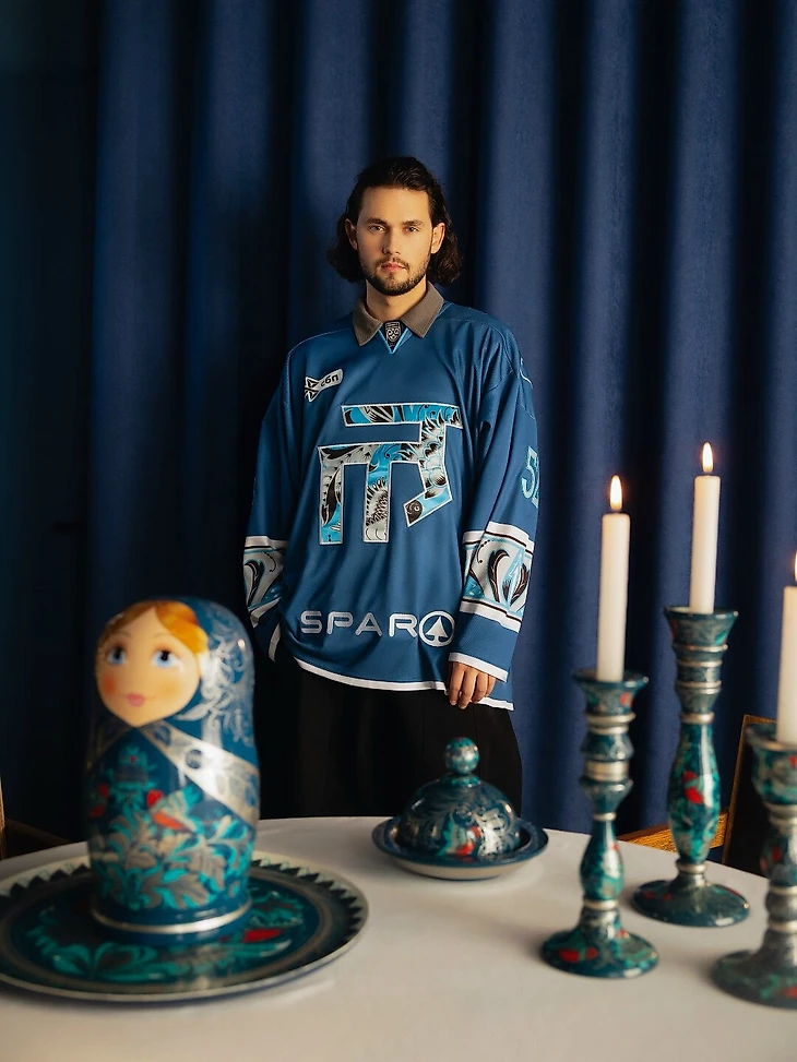 Джерси «Торпедо» вдохновлена коллекцией «Заря» художницы Нэли Ушаковой – сдержанное монохромное решение в синих и белых оттенках.