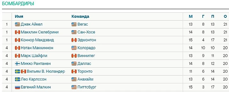 За ними идет группа из 6 игроков с 20 очками, в которую в том числе входят форварды Нэтан Маккиннон («Колорадо») и Евгений Малкин («Питтсбург»).