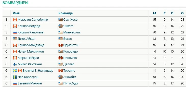 Третье место делят форварды Джек Айкел («Вегас», 21 в 13, 8+13), Коннор Макдэвид («Эдмонтон», 21 в 15, 4+17) и Кирилл Капризов (21 в 16, 9+12).