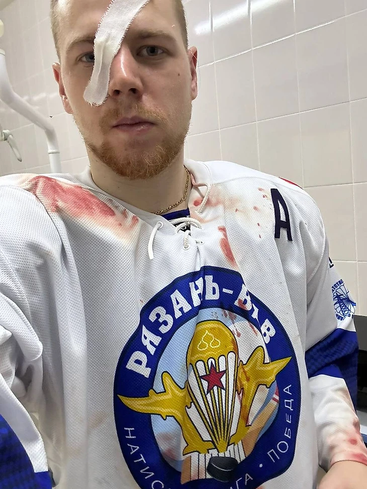 Защитник «Рязань-ВДВ» Аким Тришин получил лезвием конька по лицу во время матча Olimpbet ВХЛ.