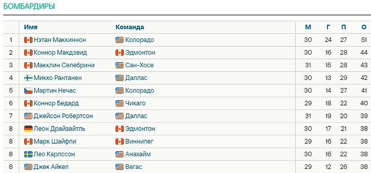 • Маккиннон первым в сезоне НХЛ набрал 50 очков. Форвард «Колорадо» лидирует в гонке бомбардиров с 51 баллом в 30 играх, за карьеру у него 1066 в 900