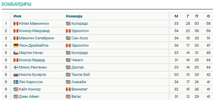 • Маккиннон лидирует в гонке бомбардиров НХЛ с 58 очками, Макдэвид – 2-й с 56, Селебрини – 3-й с 51, Драйзайтль вышел на 4-е место с 47