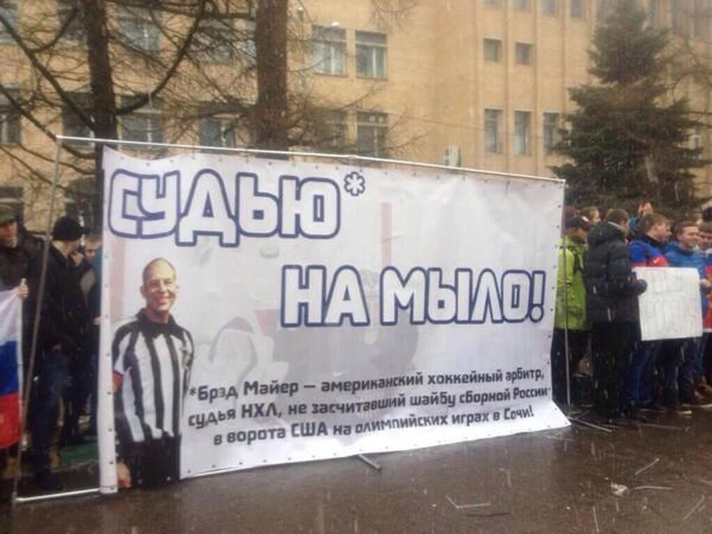 У посольства США в Москве проходит пикет, участники которого протестуют против американского арбитра Брэда Майера, судившего матч олимпийского хоккейного турнира Россия – США (2:3 Б).