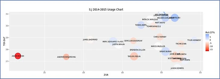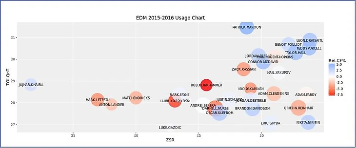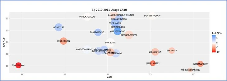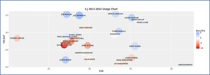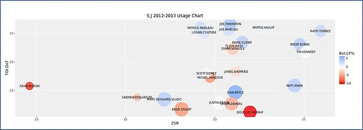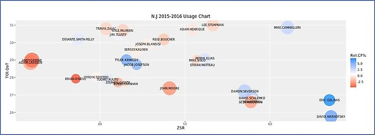 Чтобы рассмотреть применение Ларссона в "Нью-Джерси" в перспективе, воспроизведена диаграмма использования игрока из Corsica Hockey, анализирующая его относительно партнеров по команде в прошлом сезоне при равных составах. Ось Х - Коэффициент Стартовой Зоны (ZSR), показывающий отношение нахождения игрока в зоне атаки к общему времени нахождения игрока не в нейтральной зоне. Ось Y - показатель Времени на Льду относительно Партнеров по Команде (TOI.QoT), который представляет собой средневзвешенное время нахождения на льду с определенными партнерами. Размер “пузырьков”- это индивидуальный процент Времени на Льду отдельного игрока, относительно общекомандного времени. И цвета “пузырьков” - это индивидуальный показатель Corsi игрока относительно товарищей по команде (источник - Corsica Hockey).