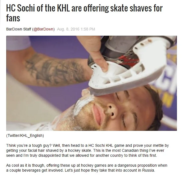 «Думаете, что вы крутой парень? Что ж, отправьте свою голову на матч «Сочи» из КХЛ и докажите свою храбрость, подставив вашу бороду под лезвие хоккейного конька. Это самая канадская вещь, которую я когда-либо видел, и я действительно разочарован тем, что мы позволили кому-то другому додуматься об этом первыми».