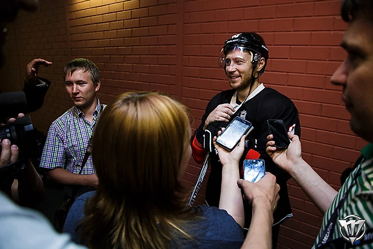 Правда, место это людное. К примеру, не успел Курьянов ответить на первые пару вопросов, как открылась входная дверь напротив и из неё длинной вереницей потянулись приехавшие на тренировку игроки «Магнитки». Кто-то тянул к Антону руку поздороваться, кто-то отпускал хохму, на ходу с улыбкой бросил колкость Илья Воробьёв. Последним прошёл Геннадий Величкин и, услышав начало нового вопроса, посоветовал ответить универсально: «По кочану!» Курьянов со смехом отмахнулся.