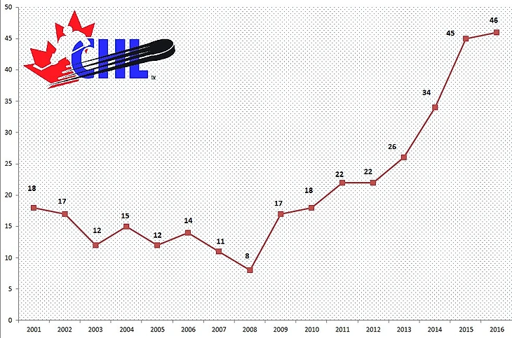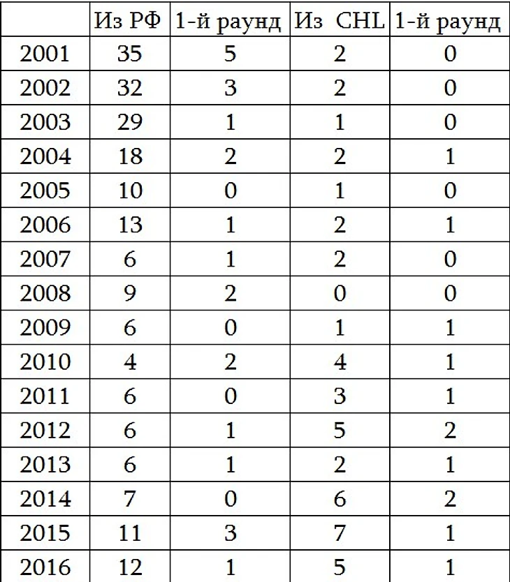 За четыре года количество эмигрантов выросло почти в два раза, достигнув рекордной отметки в 46 человек – и это не считая тех, кто отправляется в более низшие канадские лиги (игроки оттуда иногда тоже попадают на драфт, как, например, выбранный «Вашингтоном» Дмитрий Зайцев из NAHL).