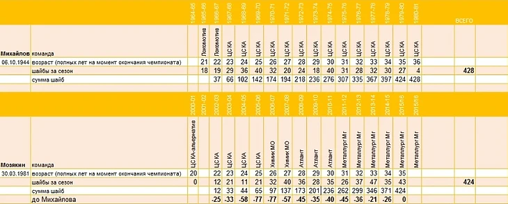 И в заключение материала сравнительные цифры бомбардирской поступи Михайлова и Мозякина, представленные в таблице.