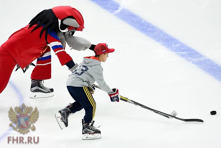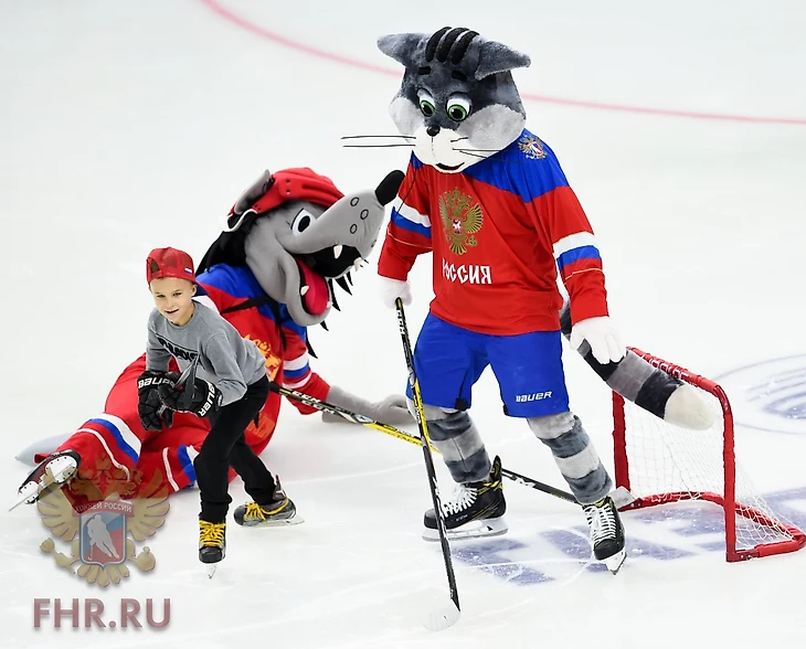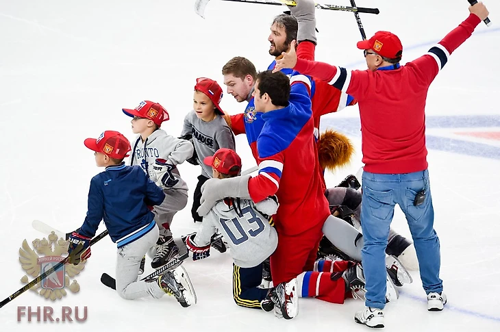 Они играли с юными хоккеистами в хоккей, а по завершению мини-матча сняли маски прямо на льду – мультяшными талисманами оказались Александр Овечкин, Евгений Кузнецов и Евгений Малкин.