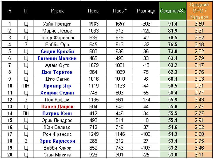 Как это работает? Возьмем для примера лучшее снайперское достижение Гретцки. В 1982 году у него было 92 шайбы за сезон при GPG 4,01. Раз этот показатель становится равен 3, то и количество шайб соответственно уменьшается: 92/4,01*3 = 69 голов. Уже не такой космос, правда?