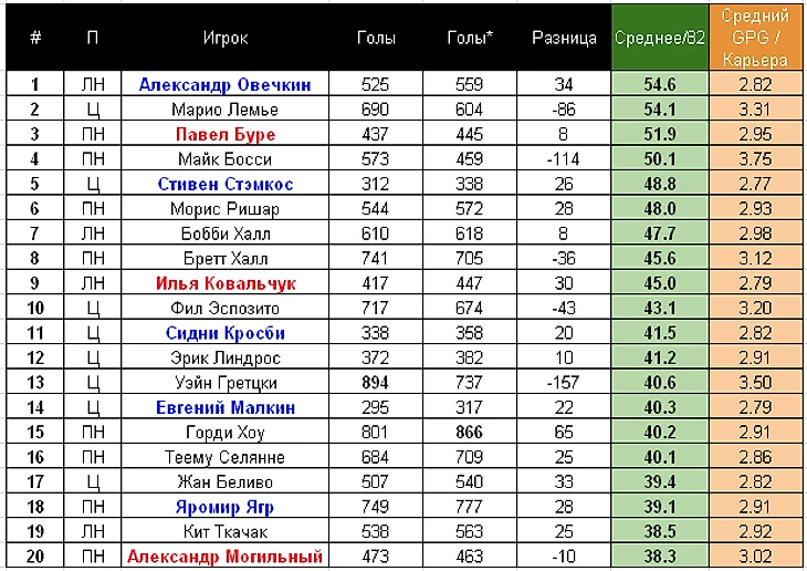 На его примере быстренько разберемся с терминами. Столбец «Голы» – все понятно, сейчас у него 525 шайб. Средний показатель GPG на протяжении его карьеры составлял 2,82 гола за игру (последний столбец). Подтягиваем до 3: 525/2,82*3 = 559 голов. Прибавилось 34 шайбы, что и отражено в столбцах «Голы*» и «Разница».
