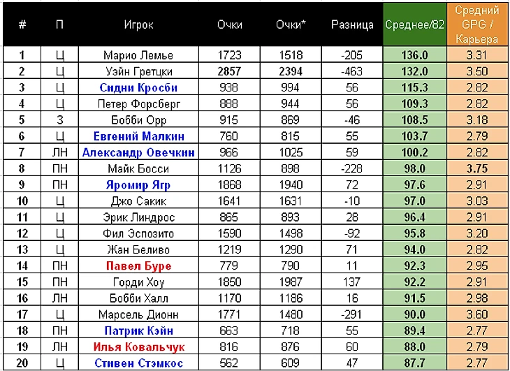 По такой же методике в столбце «Среднее/82» посчитаны и все остальные легенды. И Овечкин на данный момент опережает всех! Правда, Марио Лемье совсем рядом, и в будущем Александр может упустить преимущество из-за неизбежного возрастного спада результативности.