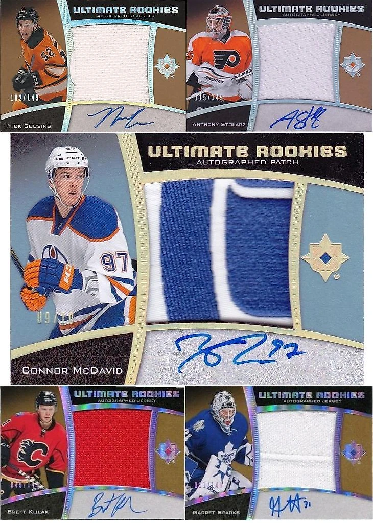 Autographed Ultimate Rookies. Основная версия карт новичков содержит автограф, проставленный непосредственно на карте, но можно достать из блока и версию с куском формы, но без авто. 70 карт в сете из них 13 тиражом 99 экз., остальные - 299 экз. Это достаточно много. Проходных игроков выше крыши, при этом есть немаленький шанс найти в блоке 2 карточки этой подсерии. 1 будет точно - это гарантировано производителем.