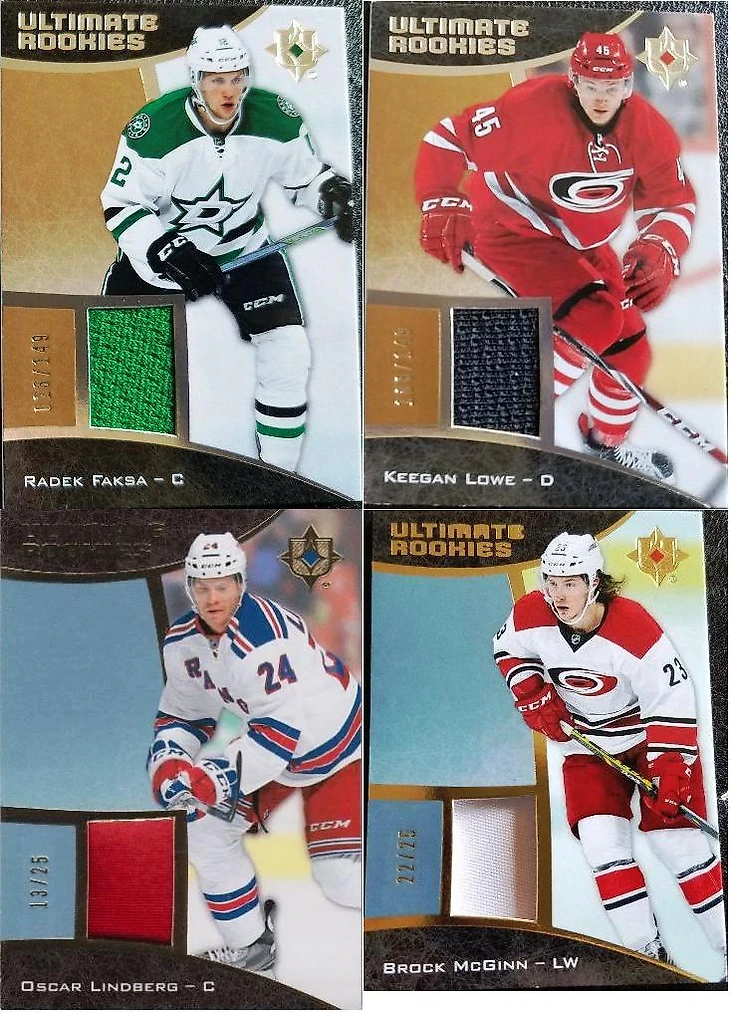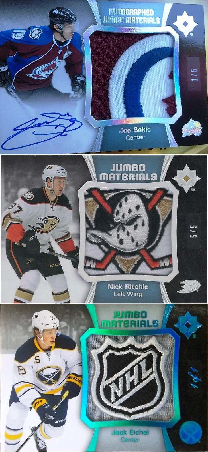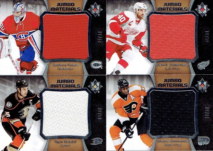 Ultimate Skills Jumbo Jersey. Практически такая же подсерия. Разница в том, что здешние куски взяты со свитеров, которые использовались на Матче Звезд, фотки тоже оттуда. 27 карт в основной версии. В патч-параллели добавляется еще 7 карт