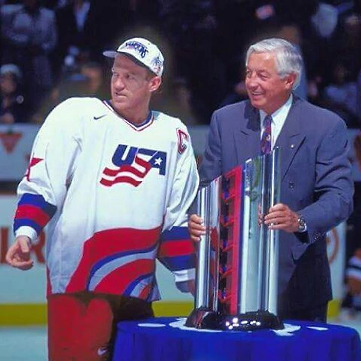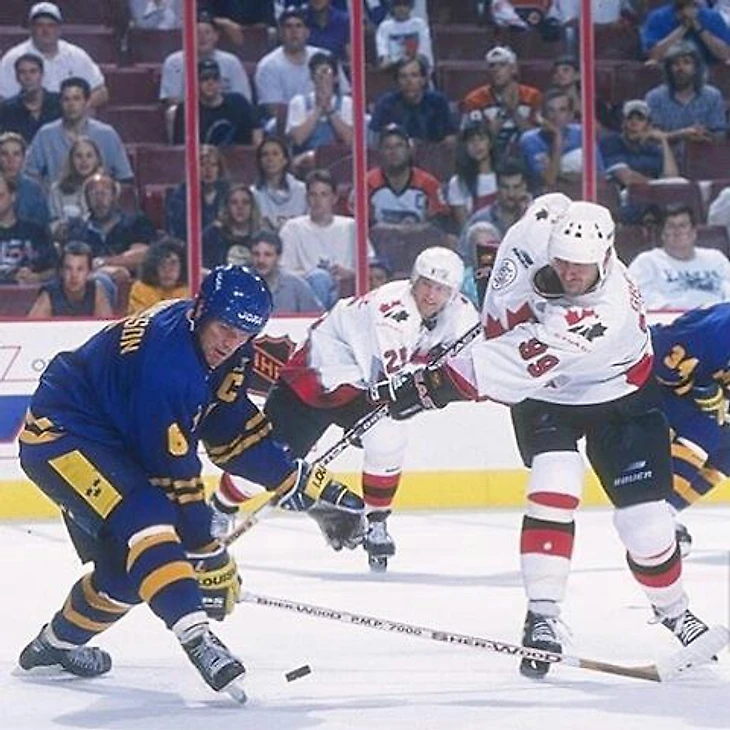 Калле Юханссон пытается блокировать бросок Уэйна Гретцки в матче на Кубке мира. 1996 год.