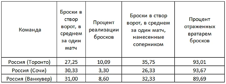 Третье – аномально высокая реализация бросков. Если ориентироваться лишь на одни цифры, то можно поверить в слова Знарка и Витолиньша, что команда пыталась вместо бросков разыгрывать до верного и буквально заводить шайбу в пустые ворота. В реальности ничего подобного не наблюдалось, при любой сколько-нибудь хорошей возможности наши игроки бросали, другое дело, что подобных возможностей было немного. Высокий класс нападающих, помноженный на банальную удачу, сделал свое дело. Бросок наотмашь Овечкина в матче со шведами, провал во втором периоде в исполнении стража ворот «янгстеров» Мэтта Мюррея, необязательный гол, пропущенный Раском после броска в ближний угол от Малкина – все эти моменты сказались на итоговых цифрах. В том же полуфинале против Канады на табло после двух периодов горели 2:2 в том числе и благодаря высокой реализации, сборная России выжала максимум из того, что было у ворот Прайса. На турнире в Сочи такого везения не наблюдалось, и во многом те же самые форварды показали напротив крайне низкую реализацию.
