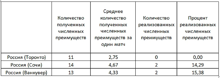 Вернемся к Олимпиадам – как и в случае бросков, в расчет пойдут показатели в матчах только против топ-команд. Что в Сочи, что в Ванкувере сборная России неплохо реализовывала лишнего (хотя – и это притом, что подготовительный период к Олимпиадам практически отсутствовал, и ни о каких контрольных матчах не было и речи. Кроме того, соперник в игре с нашей командой вынужден был нарушать правила чаще, хотя тут не стоит забывать, что турниры проходили по разным правилам.