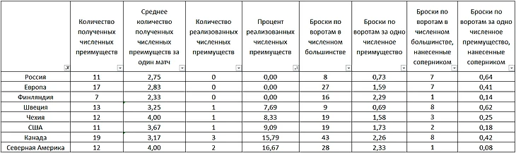 Игра в большинстве заслуживает отдельного разговора. Начать нужно с того, что сборная России редко заставляла соперников нарушать правила (реже фолили лишь на финнах), что частично характеризует атакующие действия команды в целом. Дальше отметим, что на минувшем Кубке мира большинство команд испытывало огромные проблемы с реализацией лишнего, но и тут наша сборная стоит особняком.