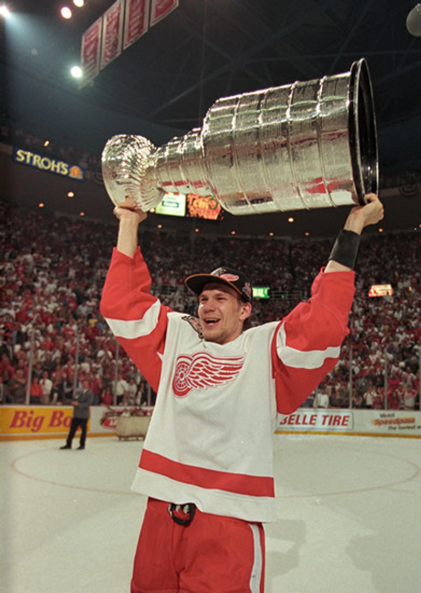 Самый известный момент Козлова в «Детройте» – четыре гола Патрику Руа в том самом матче, о котором шла речь в предыдущем рассказе сериала. Сам Козлов то ли в шутку, то ли всерьез тот момент сильно высоко не оценивает, так что лучше вспомним решающий гол в овертайме финала Запада-1995.