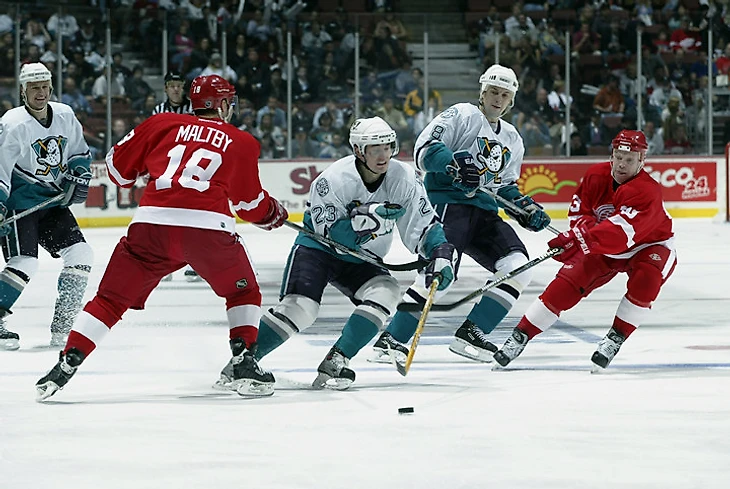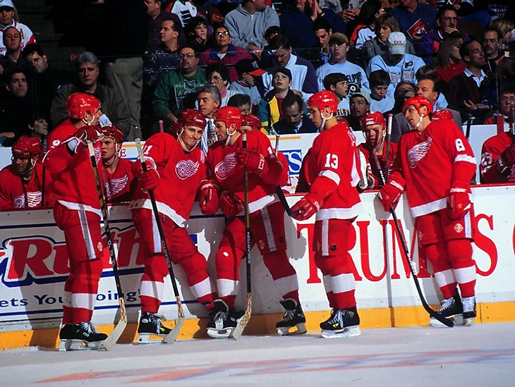 Между ними на самом деле очень много общего. В один год эти команды выигрывали регулярный чемпионат с рекордным результатом, затем через два года после этого – два чемпионства подряд. У одних было «Большое трио», у других – «Русская пятерка» и «Гриндеры». У одних – самый титулованный тренер НХЛ, у других – самый титулованый тренер НБА. Для полного сходства «Ред Уингс», увы, не хватило только титула в 1996-м.