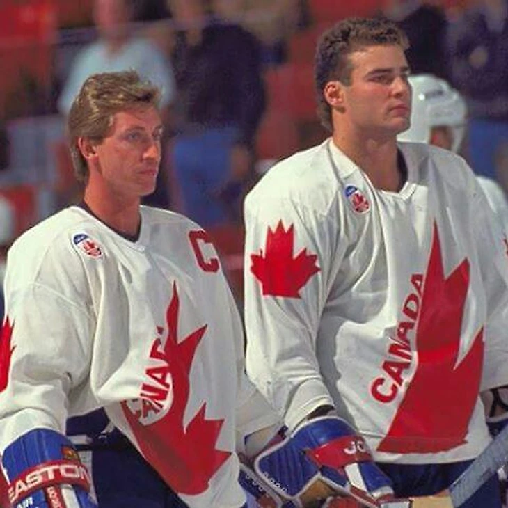 Уэйн Гретцки и 18-летний Эрик Линдрос перед матчем сборной на Кубке Канады. 1991 год.