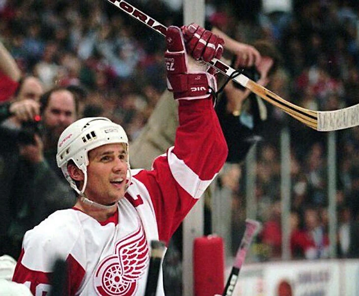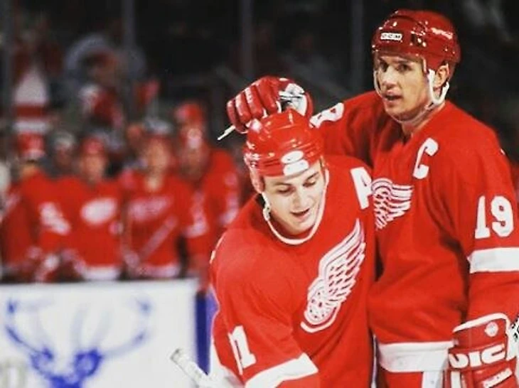 Сергей Федоров и Стив Айзерман празднуют заброшенную шайбу в матче «Детройта».