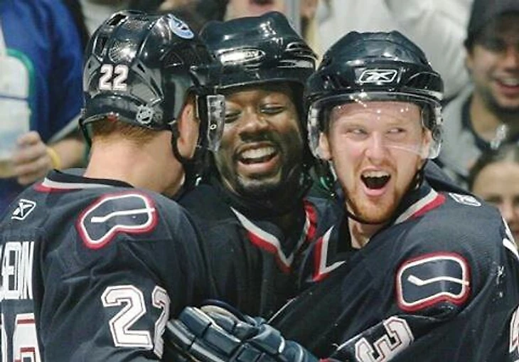 Энсон Картер и братья Седины праздную заброшенную шайбу в матче «Ванкувера».