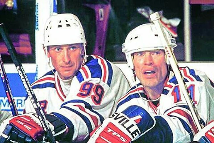 Уэйн Гретцки и Марк Мессье на скамейке «Рейнджерс».