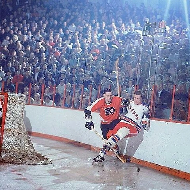 Игроки «Рейнджерс» и «Филадельфии» в борьбе у борта. 70-е.
