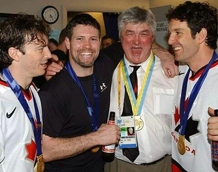 Джо Сакик, Оуэн Нолан, Пэт Куинн и Брендан Шенахан в чемпионской раздевалке сборной Канады после победы в финале Олимпийских игр-2002 в Солт-Лейк-Сити.