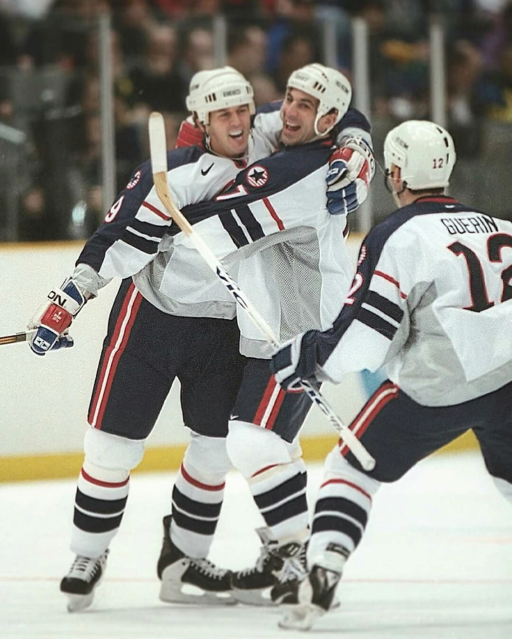 Майк Модано, Крис Челиос и Билл Герин праздную заброшенную шайбу в матче сборной США.