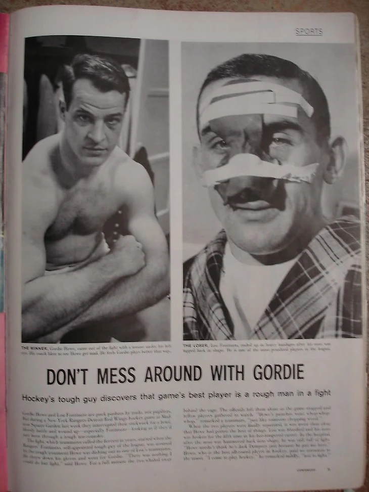 Это была игра между Детройтом и Рейнджерс. После очередной атаки на ворота, один из коньков Горди Хоу запутался в сетке. Пытаясь выбраться, Хоу заметил приближающегося к нему тафгая соперника. Нападающий казался легкой добычей, Лу даже успел нанести парочку ударов. До той поры, пока форвард Крыльев не скинул перчатки. Горди схватил Фонтинато за свитер, и серией ударов превратил лицо соперника в кровавый винегрет. К сожалению, запись боя до наших дней не дошла, зато дошло вот такое вот фото из газеты.