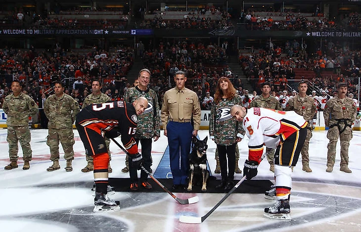 Перед матчем произошло наверное одно из самых крутых вбрасываний в истории хоккея. Его произвела собака-сапер. Выглядело это довольно мило, и капитан, вернувшийся в строй после травмы поблагодарил пса за проделанную работу, потрепав его по голове.