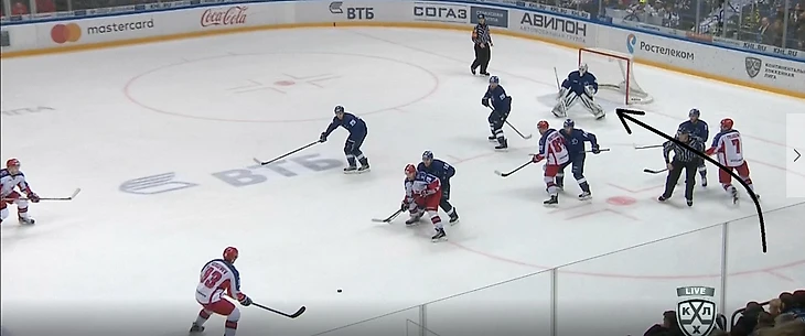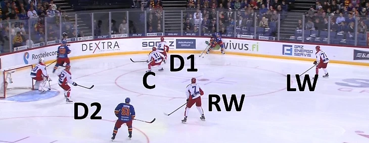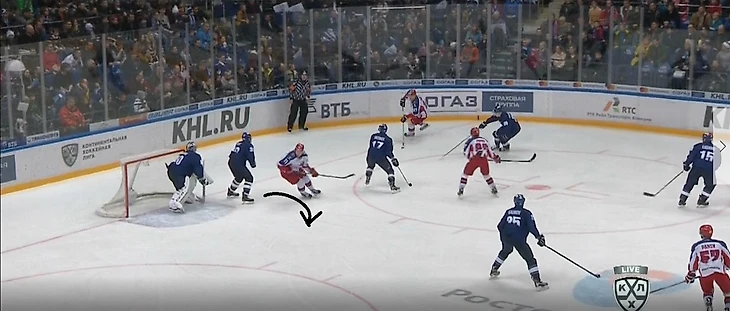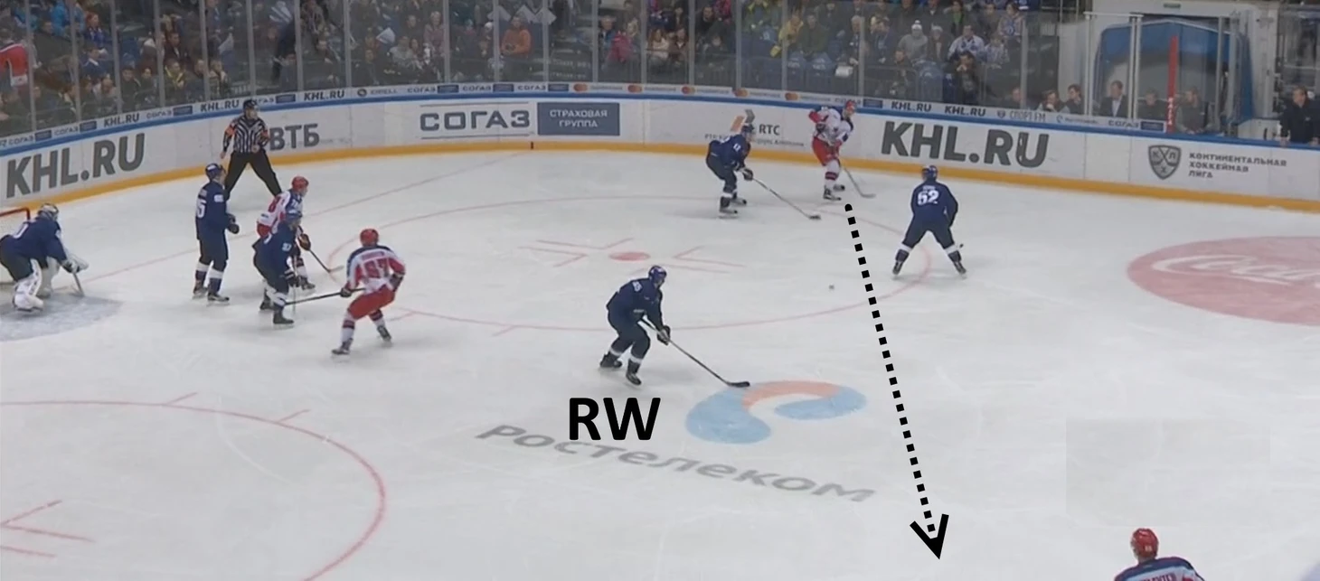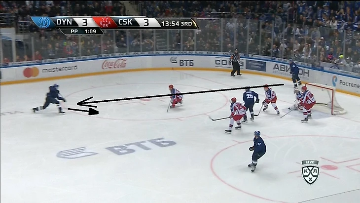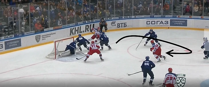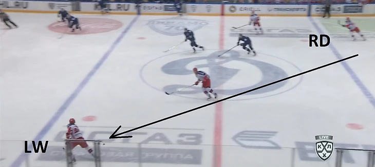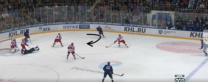 К чему всегда должен быть готов соперник «армейцев» – это подключение защитника от синей линии, который изначально после входа в зону/выигрыша на вбрасывании находится в статичном положении. Чаще всего своеобразным индикатором его движения служит овладевание шайбой крайним форвардом на противоположном краю, что хорошо видно на изображении ниже.