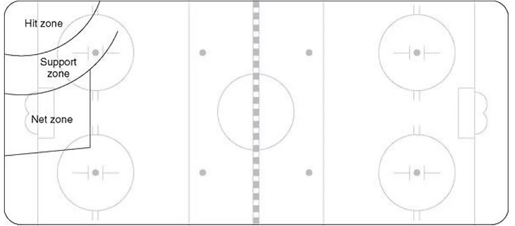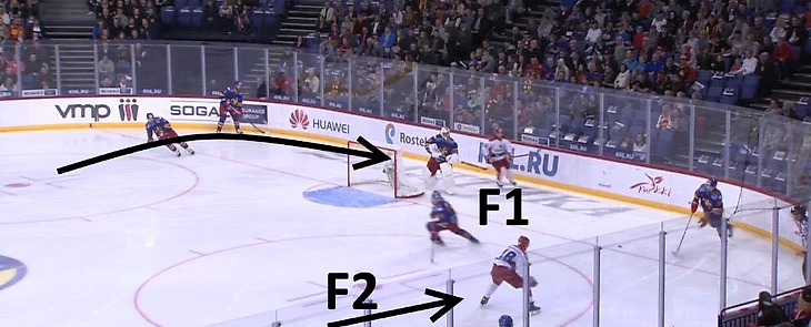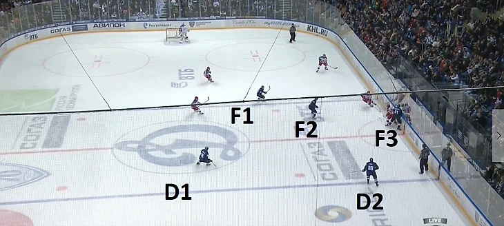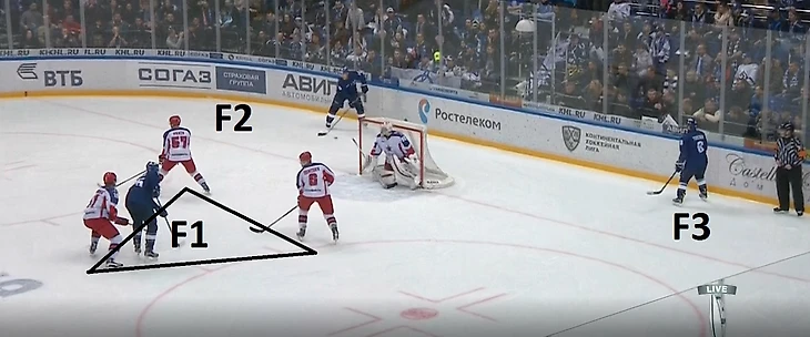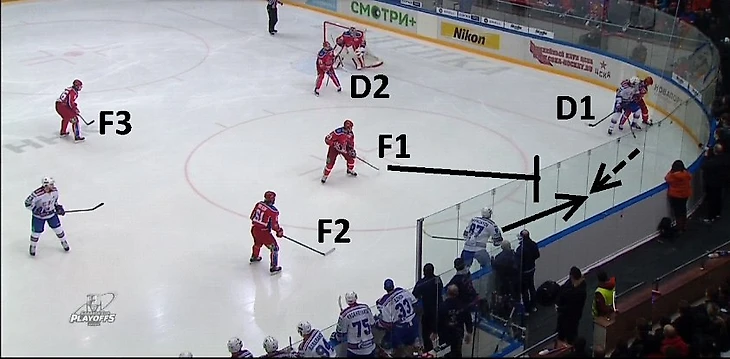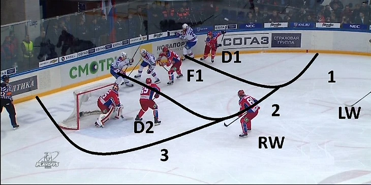 ЦСКА при позиционных атаках соперника, когда тому удается довести шайбу до лицевой линии и начинается игра в формате «3 на 3», использует систему, при которой пространство рядом с воротами условно делится на три зоны. Номер 1 на рисунке – это «hit zone». Здесь действует защитник D1, который должен быстро настигать соперника и применять против него силовые приемы. Номер 2 на рисунке – «support zone» – в ней могут действовать или защитник, или один форвард (F1). Задача игрока здесь – накрывать соперника, владеющего шайбой, и перехватывать возможные передачи за собственными воротами, чтобы не было подключений на дальнюю штангу. Ему необязательно всегда «хитовать» противника, он может оставлять для себя немного свободного пространства, если шайба еще находится в «hit zone». Во многом, именно благодаря его игре соперник при позиционной атаке не получает численного преимущества.