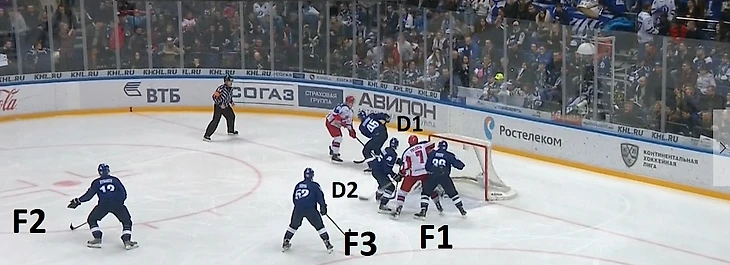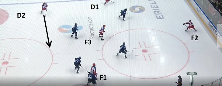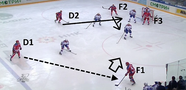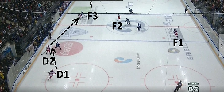 D1 (Никита Зайцев, #22) должен достаточно аккуратно играть на синей линии и стараться дистанцироваться от ближайшего соперника на три-четыре метра – это дает ему пространство для принятия правильного решения, а периодически способствует тому, что он уходит из поля зрения обороняющейся четверки. Зайцев – защитник, который всегда готов бросать, хорошо распознает трафик на пятачке. Другой его функцией является обмен шайбой с F1, в эпизоде, отображенном ниже, именно он отдает передачу под бросок.