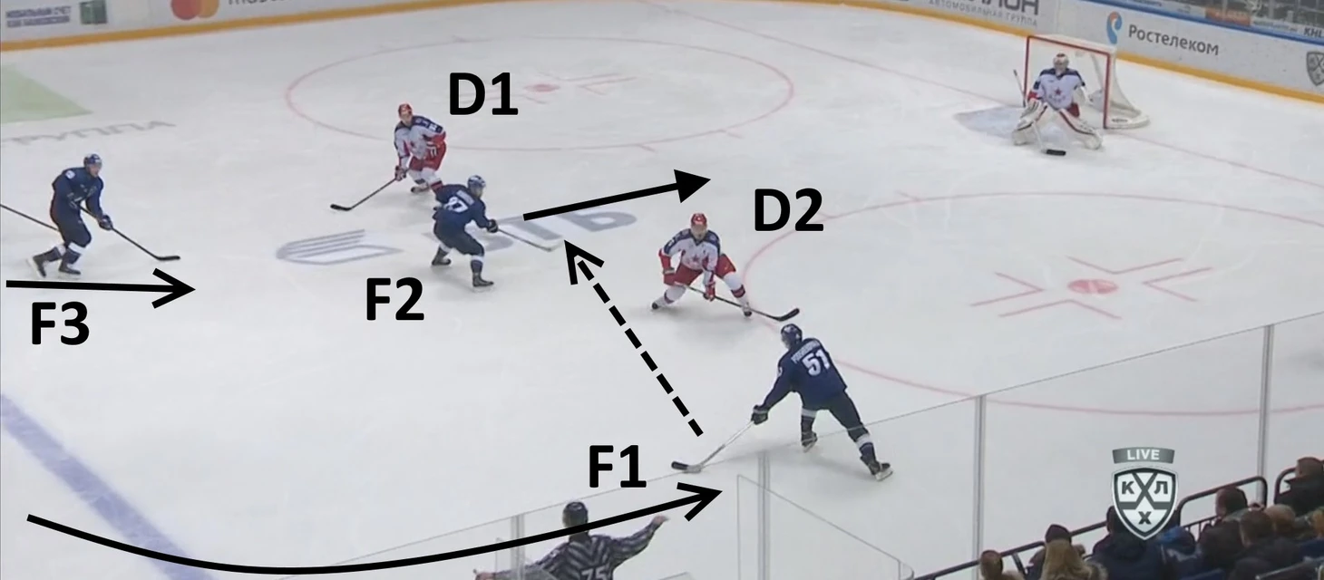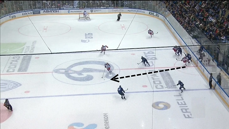 Обратим внимание на еще один момент в игре «Динамо», которое до пропущенных шайб сумело организовать контрвыпад три в два. Самое важное в таких ситуациях – уметь генерировать голевой шанс, хоть это и менее очевидная возможность, чем выход два в один. То, что впереди находятся три хоккеиста, катящихся на высокой скорости, создает дополнительные варианты для создания голевых шансов. Хоккеисты должны практиковать все виды развития атаки (обычно их выделяют четыре, и мы о них обязательно поговорим в следующих материалах). В рассматриваемом же эпизоде «Динамо» использовало систему «Midlane drive». У «Динамо» получилось создать нужную ситуацию, когда два защитника играют с двумя атакующими хоккеистами, а один хоккеист получает полную свободу. Подшендялов, грамотно оценив ситуацию, принял верное решение – отдать шайбу в «коридорчик» между двумя соперниками, благодаря чему возник голевой момент. Другим же вариантом мог быть прокат F2 вперед без шайбы и за ним, очевидно, поехал бы один из защитников, что создало бы еще более опасную ситуацию два в один.