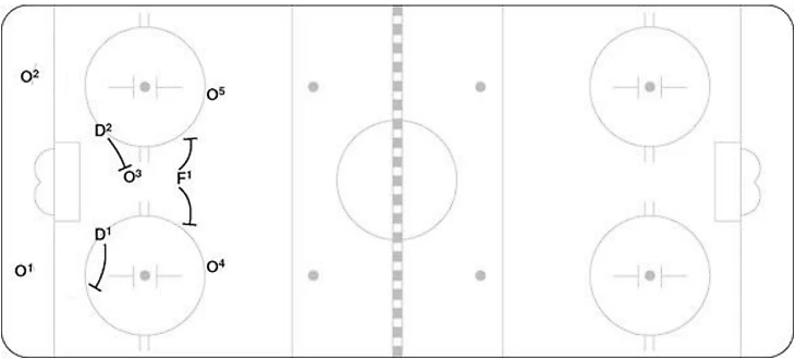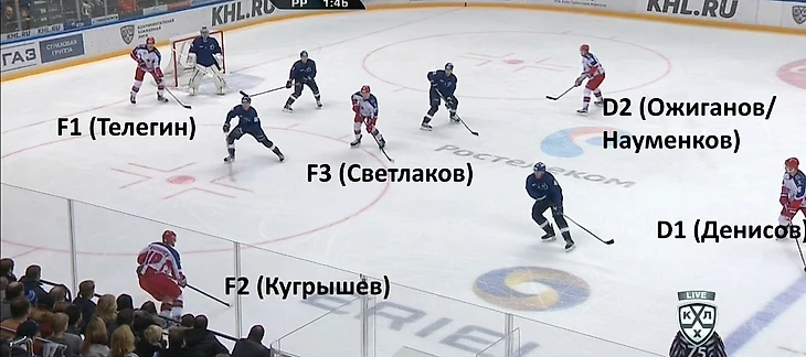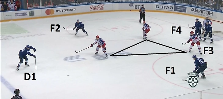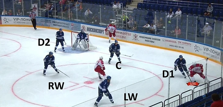 На схеме ниже мы можем видеть расположение хоккеистов «Динамо» при игре в большинстве пять на три (они помечены O1, O2, O3, O4, O5) и то, как хоккеисты ЦСКА должны были бы в идеале распределить роли между собой. Данная расстановка используется в меньшинстве чаще всего, когда у соперника два игрока на синей линии (как раз как у «Динамо»). F1 остается в центре своей зоны с готовностью перехватить любые передачи через центр. Защитники же (D1 и D2) составляют основание треугольника. Когда шайба находится близко к лицевой линии, к примеру, у O1 (атакующего хоккеиста), один из защитников начинает выкатываться под него, а второй покрывает пространство возле пятачка. Однако бело-голубые заметно усложнили задачу тем, что поставили два человека за ворота, противодействовать такому большинству с тактической точки зрения крайне сложно.