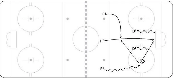 На схеме ниже отображены все вероятные шансы разыграть шайбу при выходе три на два, где, по большому счету, нет ничего сложного для хоккеистов атакующей команды. Закрашенные полосы – движение хоккеистов без шайбы, волнистая линия – движение хоккеистов с шайбой, пунктирные линии – передачи.