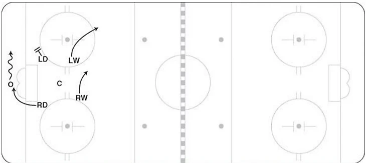 Когда сопернику удается закрепиться в зоне и начать позиционную атаку на флангах (как правило, вдоль бортов), ЦСКА сразу стремится создать для себя численное преимущество «пять на три», сгоняя игру на одну половину льда. Как правило, подобным образом легко «отрезаются» защитники, так как все варианты для передач на них перекрыты. Диагональный пас к левому борту легко может перехватить F3, за передачи на другого защитника отвечает F2. D1 борется в углу площадки, а F1 поддерживает его и идет в силовую борьбу, если соперник пытается выполнить передачу по борту. D2 отвечает за пространство перед воротами, а F3 закрывает «slot area», поэтому исключены опасные переводы в центр под бросок.