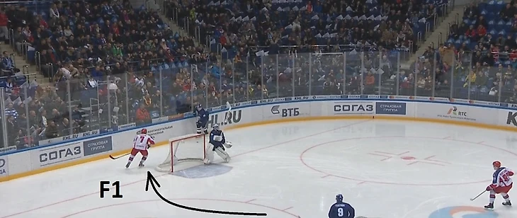 И это принесло свои плоды в первой же смене матча против бело-голубых. В рассмотренном эпизоде в качестве F1 выступает нападающий Иван Телегин, который совершил отбор шайбы за воротами, позволивший ЦСКА организовать первую позиционную атаку и дебютный бросок по воротам «Динамо».