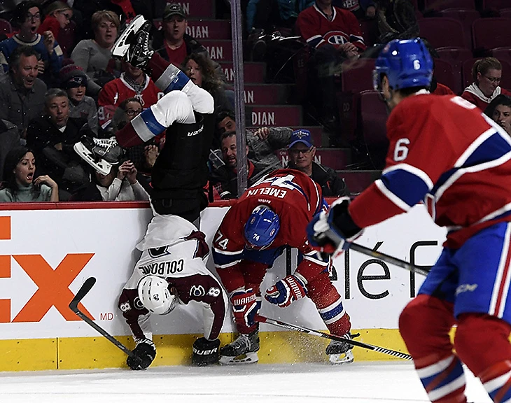 Защитник «Монреаля» Алексей Емелин роскошной мельницей отправляет в полет нападающего «Колорадо» Джо Колборна, а затем жестко встречает Джерома Игинлу, проводившего свой 1500-й матч в НХЛ. Разумеется, завязалась потасовка.
