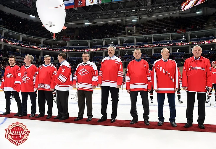 Эта фотография согреет душу каждого поклонника красно-белых. Разные поколения спартаковцев перед матчем стояли вместе, представляя собой наглядное пособие по преемственности поколений. Каждый из ветеранов вписал не одну славную страницу в историю нашего хоккея, да и молодой голкипер Александр Трушков (крайний слева) уже успел внести в копилку Кубок Харламова - главный трофей Молодежной Хоккейной Лиги.