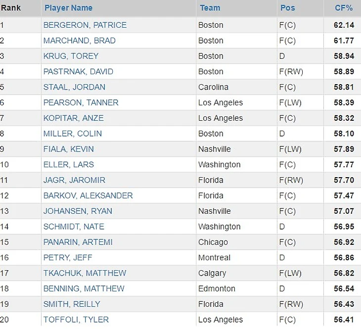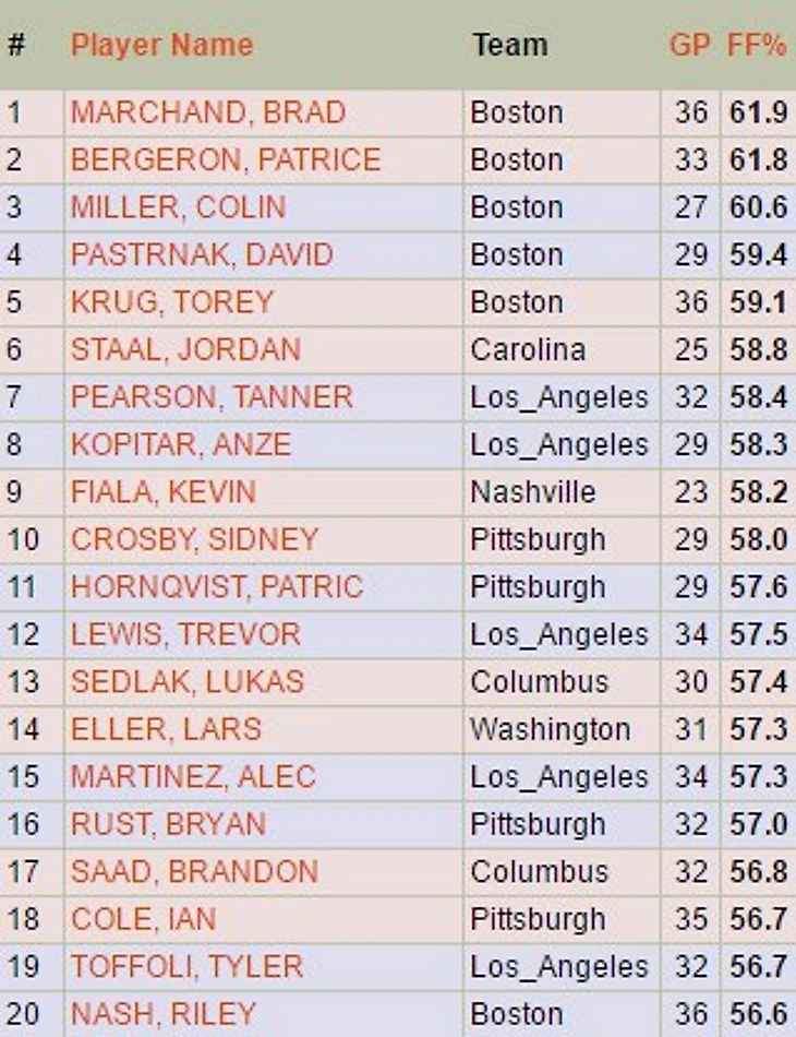 Лидерами по данному компоненту являются: Сидни Кросби и Патрик Хёрнквист (Оба - Питтсбург) - 54.44 и 54.19 соответственно, следом за ними следует целое звено Бостона практически в полном составе - Брэд Маршанд - 53.76, Колин Миллер - 53.46, Давид Пастрняк - 52.52 и Патрис Бержерон - 52.21;
