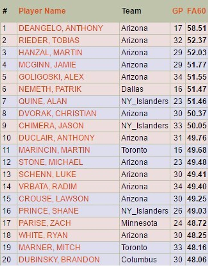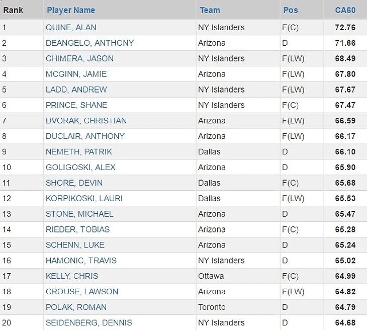 Показатель, который во многом объясняет многие неудачи Айлендерс, Аризоны и Далласа. Но если у Далласа есть 2 более или менее играющих звена, и они могут позволить себе иметь звенья дефенсив и чекинг форвардов, но когда ведущие игроки (и те, от кого ждали прогресса) Айлендерс большинство времени проводят в обороне, то о каких хороших результатах может идти речь.