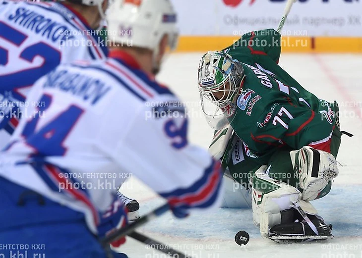 СКА атаковал, «барсы» жались к воротам, и всё шло к счёту 0:2. Первую по-настоящему хорошую атаку провело звено Ткачёва. Именно им удалось хорошо закрепиться в зоне и провести первую длительную атаку. Затем 2 минуты штрафа выписали Дамиру Мусину. У СКА снова был шанс удвоить преимущество, но Павел Дацюк не дал им это сделать – капитан команды присел в штрафной бокс. После того, как составы команд выровнялись, для «Ак Барса» начался лучший отрезок в матче. Нападающие почувствовали игру, стали чаще лезть на ворота гостей. Пошла красивая игра с нашей стороны, которая очень радовала болельщиков. Кто смотрел игру по Матч ТВ, должны помнить статистические данные по броскам за первый период, которые огласили комментаторы. За первую часть периода чудовищное преимущество по броскам было у СКА, а потом у «Ак Барса». Очень хорошо смотрелись Чибисов, Ткачёв и Секач. Постоянно нагнетали обстановку в ворот Коскинена. Так же неплохо выглядели и Попов с Глинкиным и Глуховым. Но результат принесло другое звено Казани. Охтамаа доставил шайбу в чужую зону, Обухов бросил с левого фланга, Коскинен отбил, Малыхин подобрал шайбу и сравнял счёт. Бесспорно, важный гол. Федя сегодня вообще герой матча. После этого «Ак Барс» не ушёл из зоны СКА. Мы продолжили давить на ворота. Через 2 минуты после шайбы Малыхина случился второй гол в ворота Коскинена. Степан Захарчук зарядил свою пушку и снарядом угодил в ногу Михаилу Глухову, от которой шайба отлетела в ворота. Помню, пару сезонов назад мы пару шайб забили пятой точкой. В матче с ЦСКА отлетело в ворота от оо Артёма Лукоянова, потом верхом на шайбе в ворота заехал Дмитрий Обухов. Теперь вот икрами забивает. Но как бы то ни было, и после второго гола «Ак Барс» не сбавил обороты. Творилось что-то невероятное. Не известно, как бы закончился период, если бы не ошибся Эмиль Гарипов. Голкипер выкатился из ворот и выбросил шайбу прямиком на клюшку сопернику. А далее пару передач и Вадим Шипачёв сравнял счёт. На Эмиля обрушилось настоящее цунами из критики. Да, он действительно ошибся, и этот гол остудил кровь «барсам».